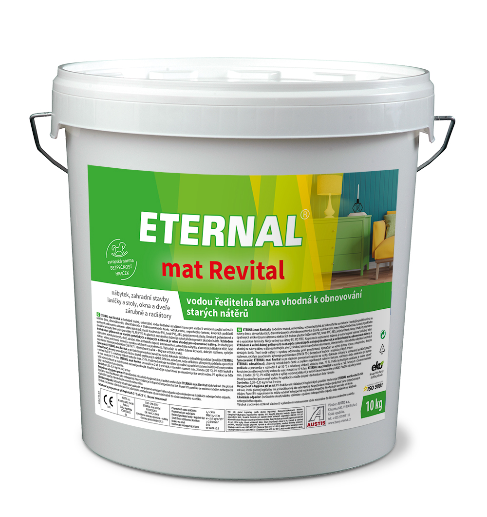 ETERNAL mat Revital je hedvábně matná univerzální vodou ředitelná akrylátová barva pro vnitřní i venkovní použití určená k nátěrům dřeva, kovových podkladů opatřených antikorozním nátěrem, dřevovláknových a dřevotřískových desek, sádrokartonu, pohledového betonu a třískocementových desek.