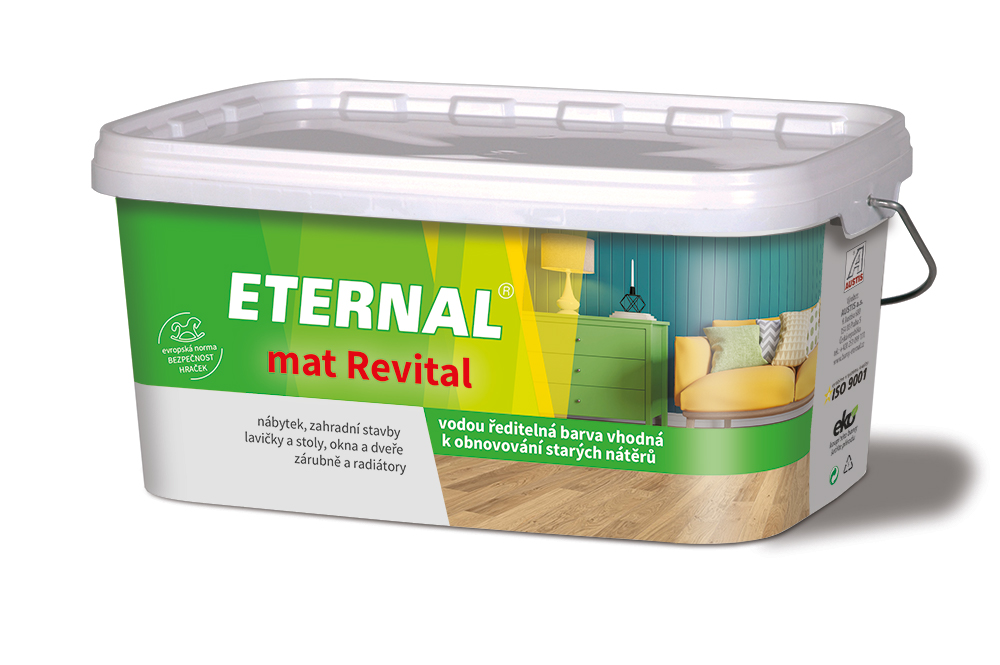 ETERNAL mat Revital je hedvábně matná univerzální vodou ředitelná akrylátová barva pro vnitřní i venkovní použití určená k nátěrům dřeva, kovových podkladů opatřených antikorozním nátěrem, dřevovláknových a dřevotřískových desek, sádrokartonu, pohledového betonu a třískocementových desek.